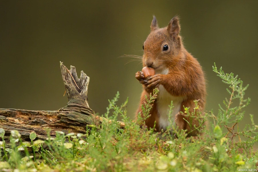 На картинке изображена красная белка с кустарниковым хвостом, стоящая в лесной или лесной среде. Белка занимается деятельностью, держа в лапах то, что выглядит как кусок пищи, возможно, орех или фрукт. Расположение включает в себя некоторую растительность и упавший ствол дерева на земле поблизости.
