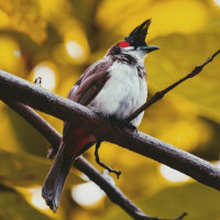 The image shows a small bird perched on a tree branch. The bird has a distinctive red and white plumage, with a red crest on its head. It appears to be in an outdoor setting with sunlight filtering through the foliage, casting shadows and highlighting the colors of the leaves.