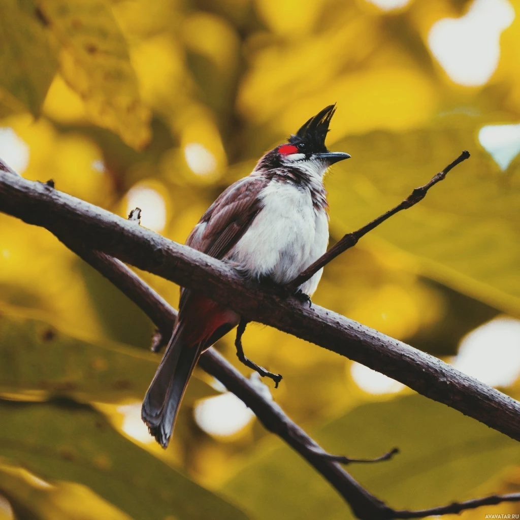 На снимке изображена маленькая птица, сидящая на ветке дерева. Птица имеет отличительное красно-белое оперение, с красным гребнем на голове. Похоже, что он находится на открытом воздухе с солнечным светом, фильтрующим листву, отбрасывающим тени и выделяющим цвета листьев.