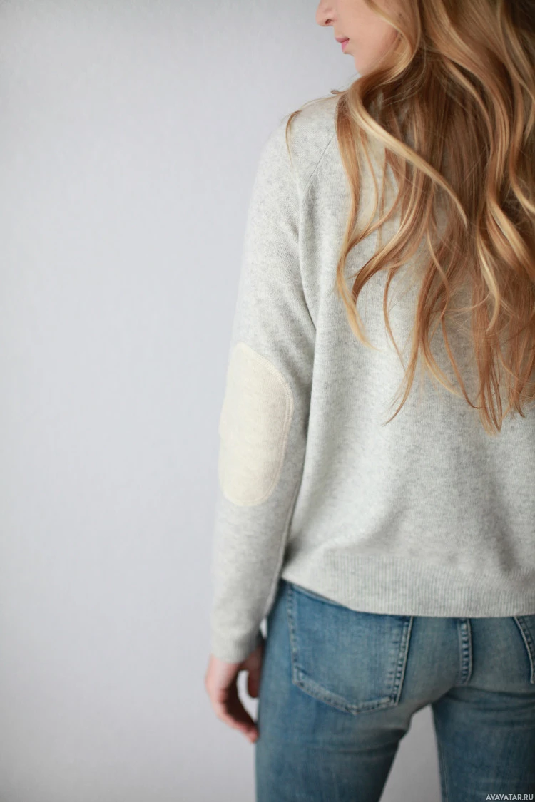 the back of a woman who appears to be blonde and wearing a light-colored knitted sweater. She has her hair styled in