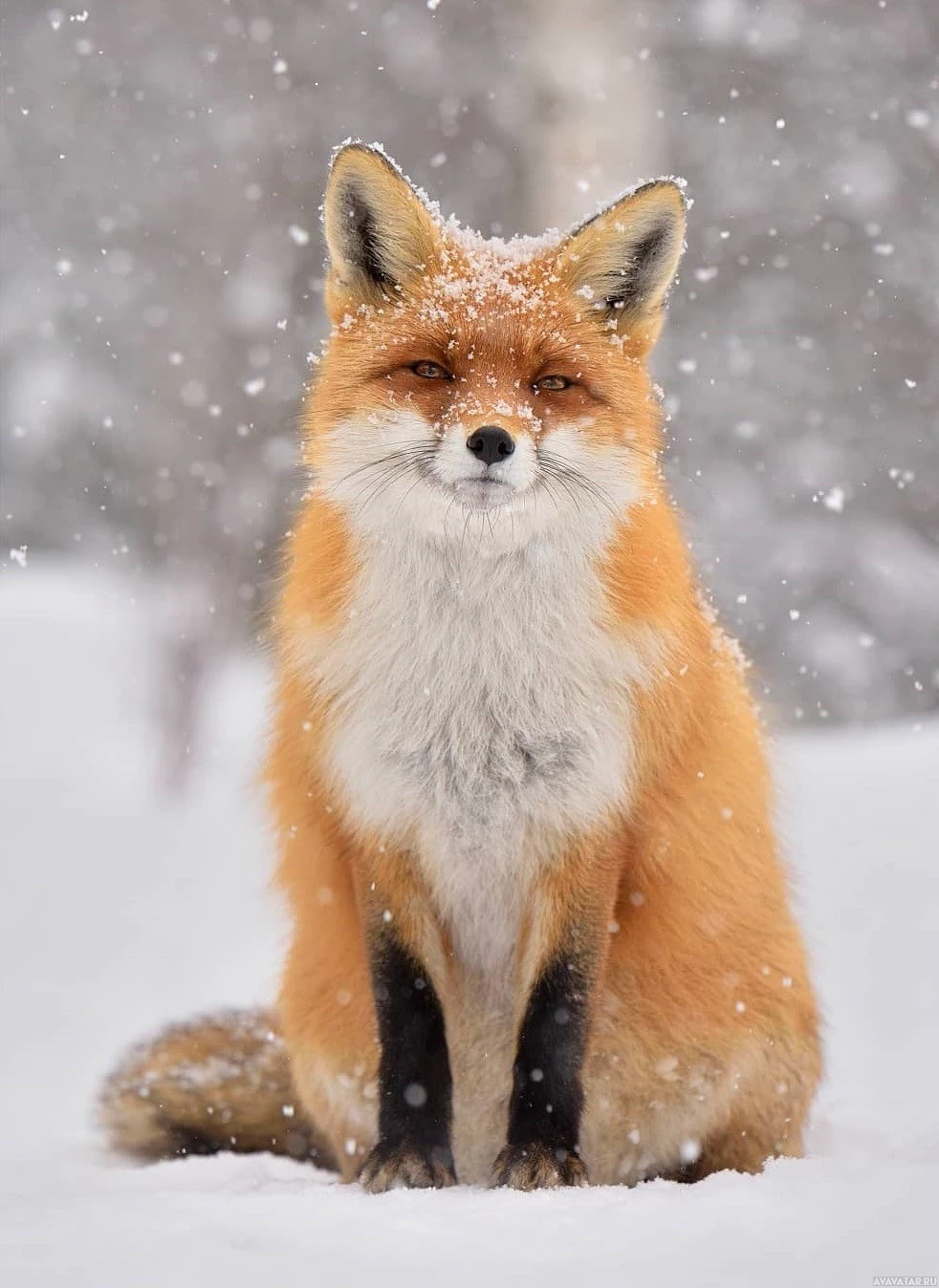 a red fox sitting in the snow. The animal appears to be looking directly at the camera, and its fur is covered with snowflakes, suggesting it may have been sitting there for a while or that the snowfall is quite heavy. The background is not clearly visible due to the snowstorm conditions but likely features
