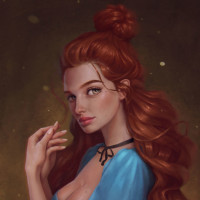 a fair complexion and is wearing what appears to be a blue, possibly medieval-style dress with a neckline that could suggest she's in a formal or special occasion setting. Her expression is neutral, and she is looking directly at the viewer. The background is softly colored with