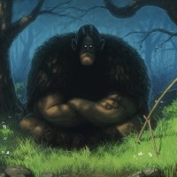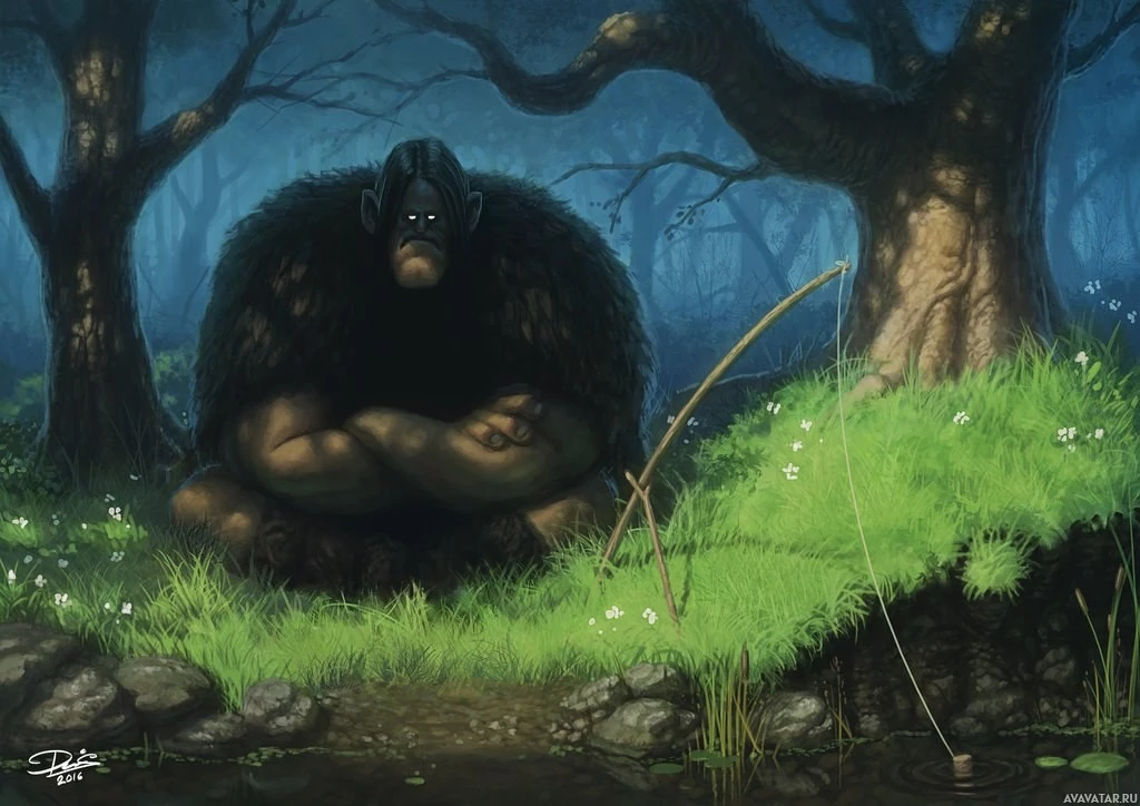 a fantasy scene with a character that resembles a traditional representation of a monster, likely inspired by folklore or mythology. This creature is depicted sitting on a grassy area near water, appearing to be engaged in fishing, as evidenced by the presence of what seems to be a fishing rod and a small