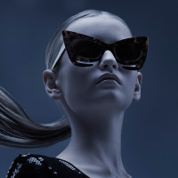 На снимке изображена женщина в солнечных очках. Ее волосы убраны таким образом, что она дует назад, как будто она движется, или есть ветер, который добавляет динамический элемент к фотографии. Женщина позирует с уверенностью и уравновешенностью, способствуя общей стильной и модной атмосфере образа. Она одета в то, что кажется блестящей или блестящей одеждой, что придает гламурное ощущение ее внешности.