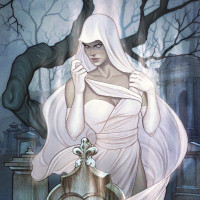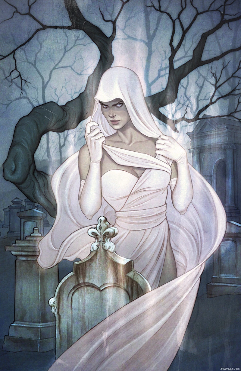 The image features a girl dressed in what appears to be an elegant or ghostly attire, suggesting she could be portraying a character like a witch, ghost, or spirit. She is holding
