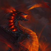 molten rock, suggesting a scene of great heat or destruction. The artwork has a dramatic style, emphasizing the power and presence of