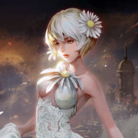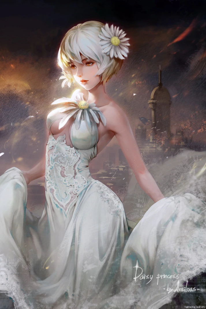 flowing dress and has a flower in her hair, giving her a soft and romantic appearance. The background suggests a somewhat dramatic or war-like setting, which contrasts with the character's