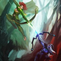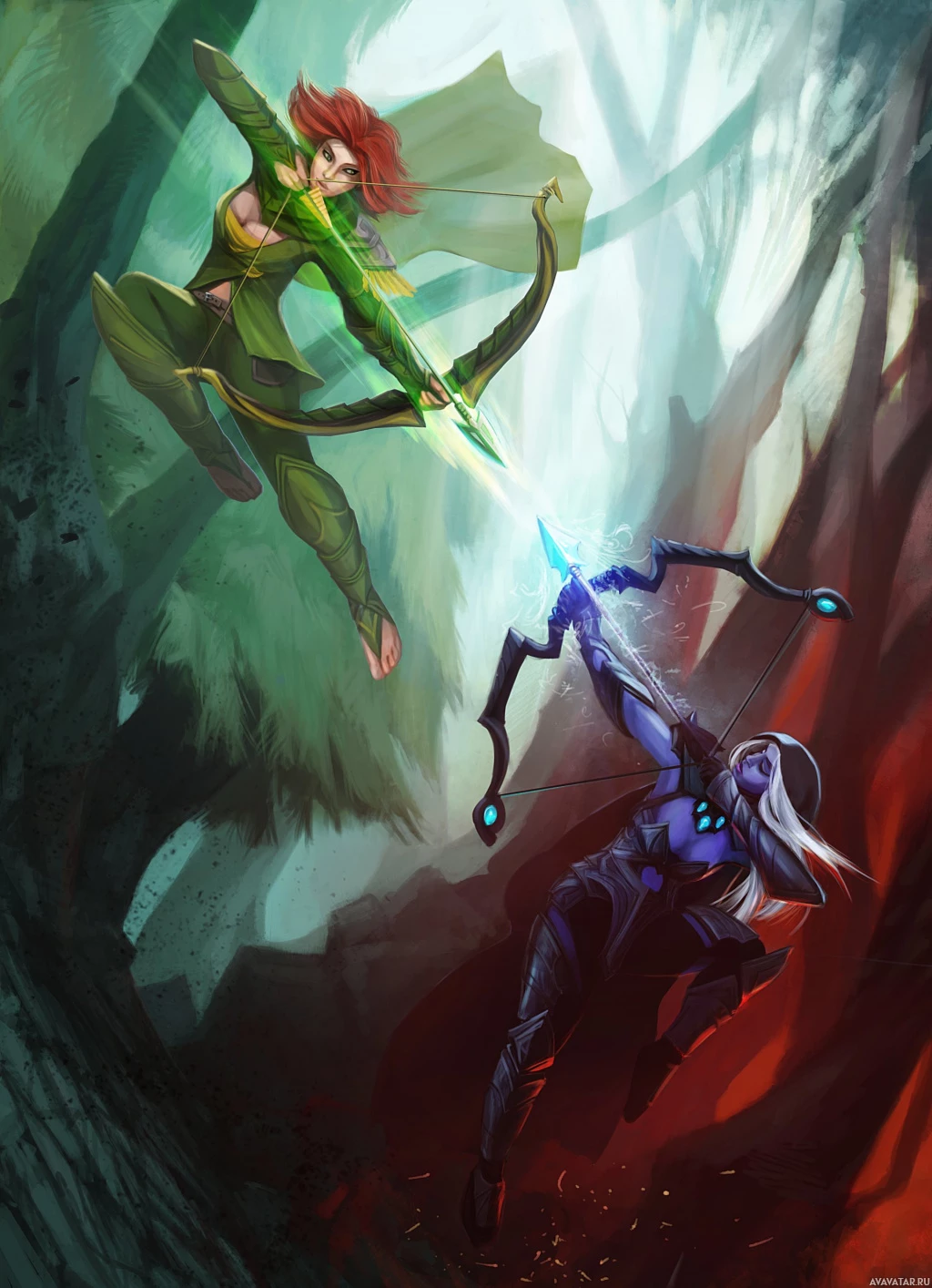 the video game Dota 2. On the left, there is a character known as Windranger, who appears to be firing an arrow with a green and white bow. To the right, there is a character called