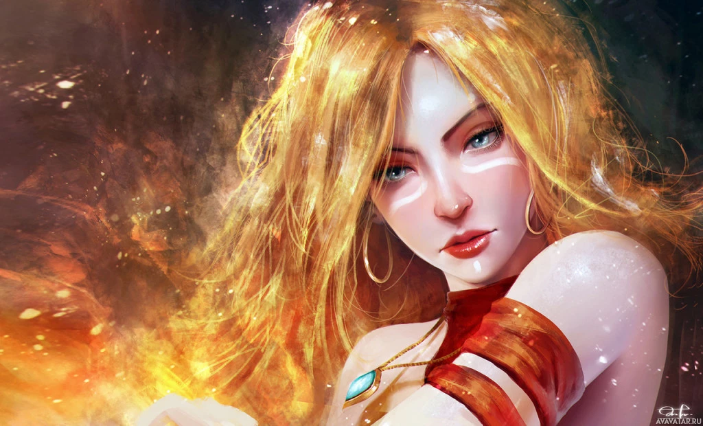 the video game Dota 2. Her name is Lina and she appears to be a warrior or mage-type character with a focus on