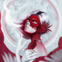 celestial bodies around her head. The overall mood conveyed by the artwork seems to be one of mystery, elegance, and possibly introspection.