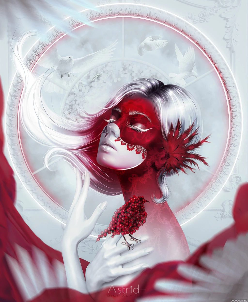 a sense of contemplation or emotion. The character is set against a backdrop of red and white colors, with abstract elements that may represent stars or