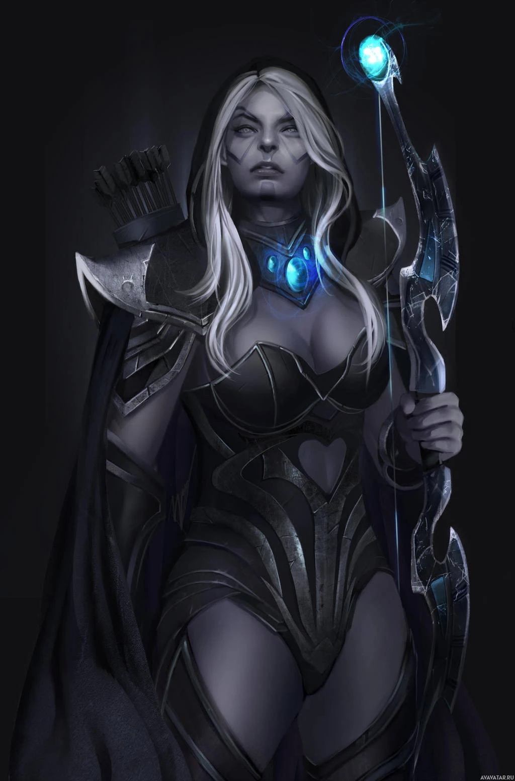 the video game Dota 2. She is depicted in armor with fantasy elements, holding two bows and arrows, and has long