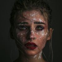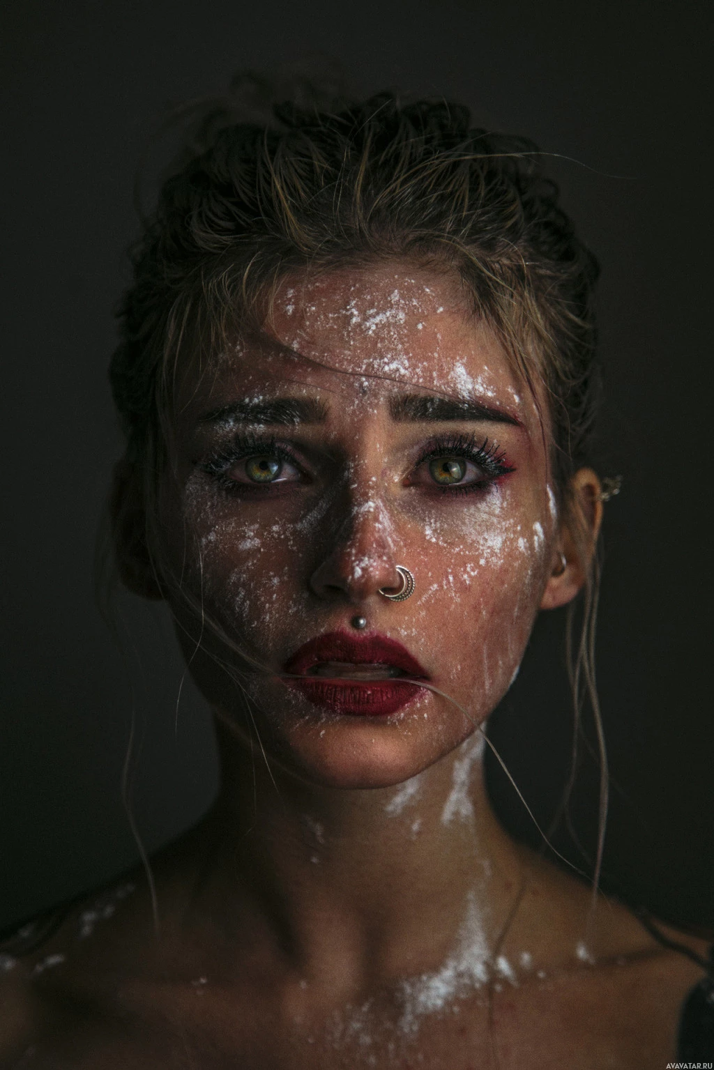The image shows a woman with her face smeared with what appears to be white powder or paint. She has red lipstick and her eyes are open wide, looking directly at the camera. There is no bowling-related object or context visible in the picture. It seems to capture an artistic or dramatic moment rather than a sporting activity.
