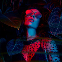 an outdoor setting at night or in a dimly lit environment. The overall vibe of the image is quite mysterious and stylish, possibly suggesting a fashionable, edgy theme.