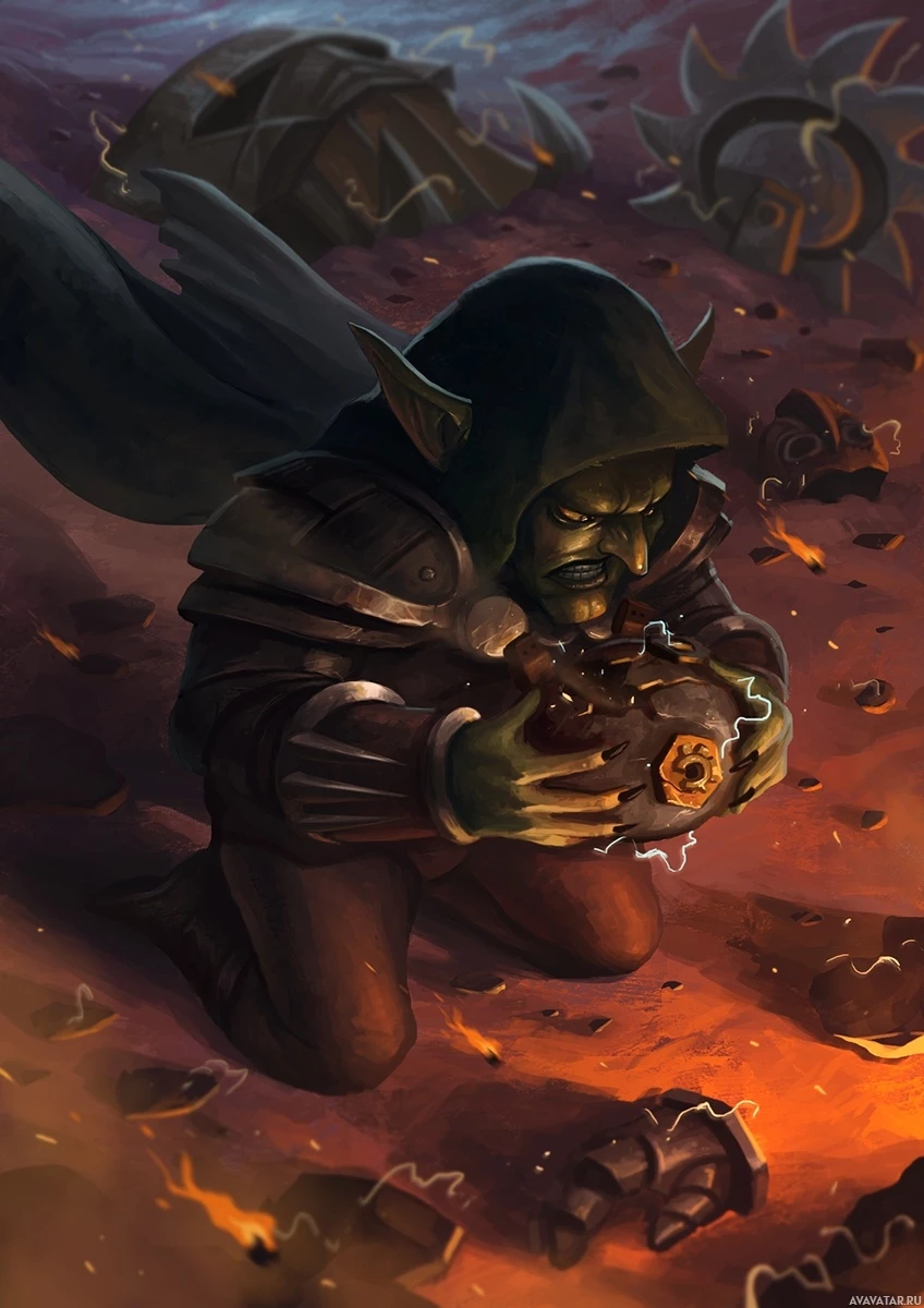 a fantasy character, often referred to as a goblin or similar creature, who is hooded and kneeling. The character appears to be holding something precious in their hands, possibly a gemstone or some sort of