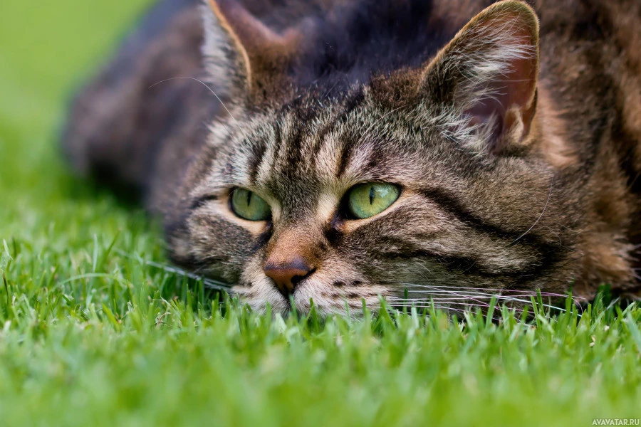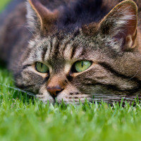 The picture shows a cat lying on grass. It appears to be a domestic or feral cat with a tabby coat, characterized by