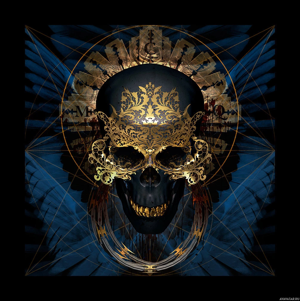 The image shows a stylized depiction of a human skull with an elaborate gold design, which includes