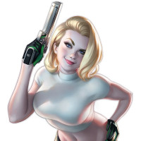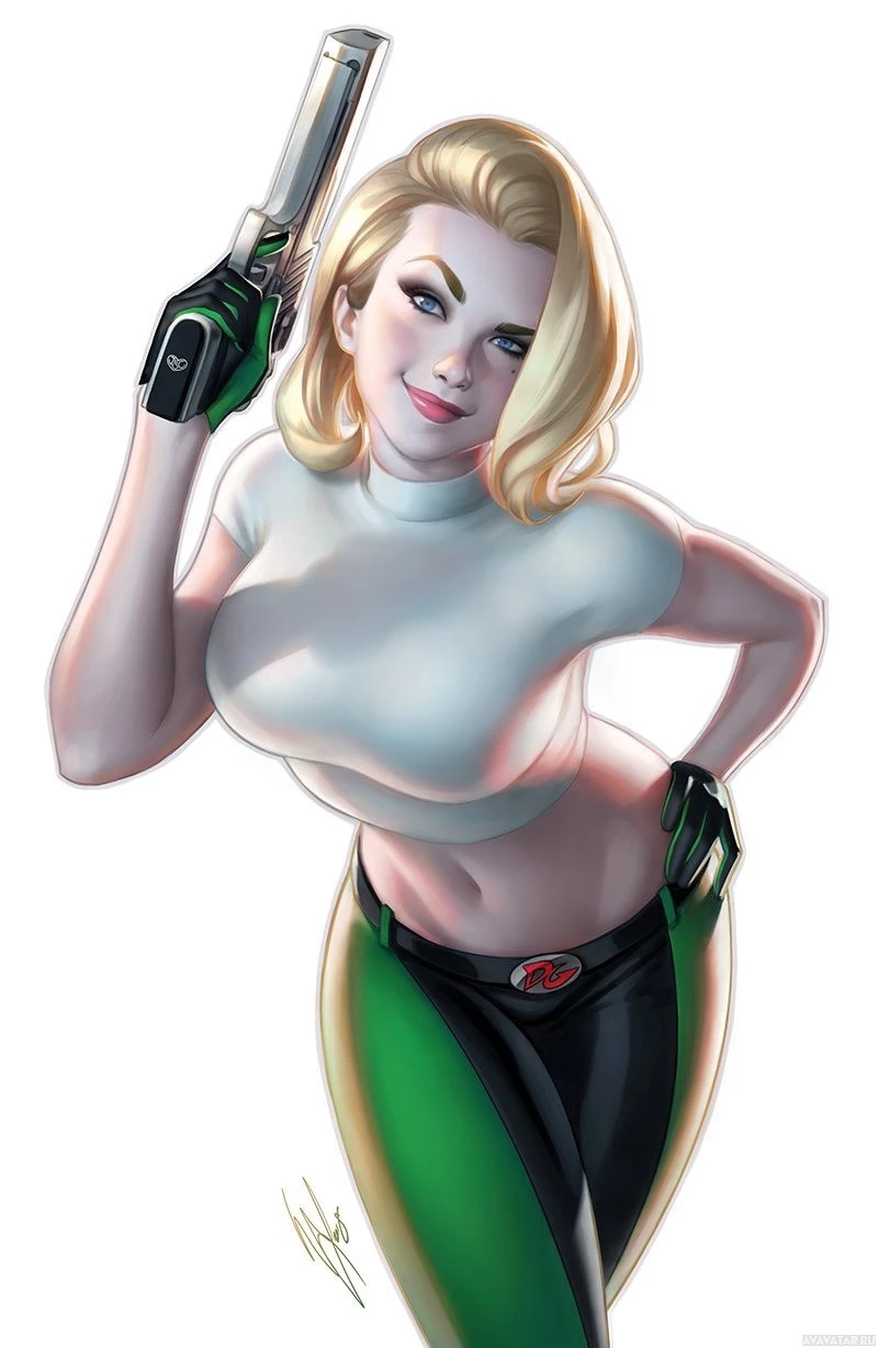 blonde hair and is holding a gun, which could suggest she might have a role in law enforcement or as an agent of some sort within her narrative context. Her outfit consists of a green top with white trim, a black belt, and