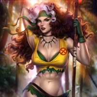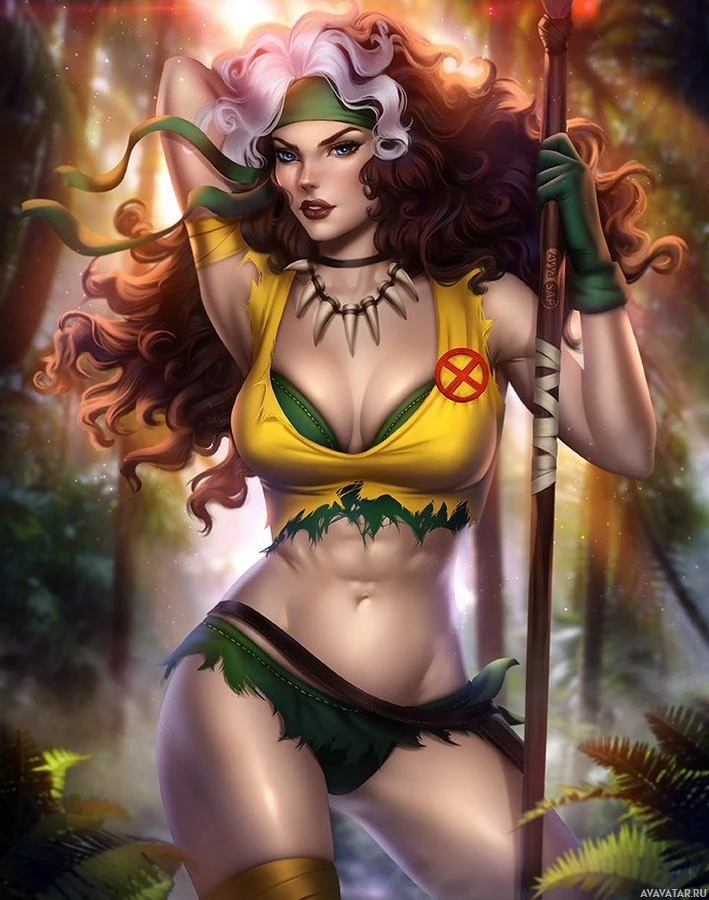 the X-Men comics and movies. The character is depicted in a stylized, hyper-sexualized manner that is not typical for mainstream
