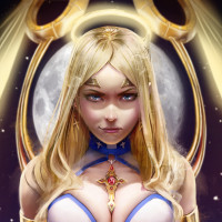 an elaborate armor and accessories that suggest she might be an angelic or divine figure. Her expression is stern, and she is looking directly at the viewer. The background includes a crescent moon above a starry sky, adding to