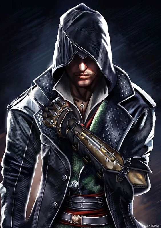 The image depicts a character from the Assassin's Creed series, which is an action-adventure video