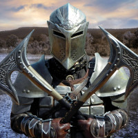 The image shows a person dressed in what appears to be armor from a historical or fantasy setting. This attire includes a helmet with a faceguard, which is characteristic of