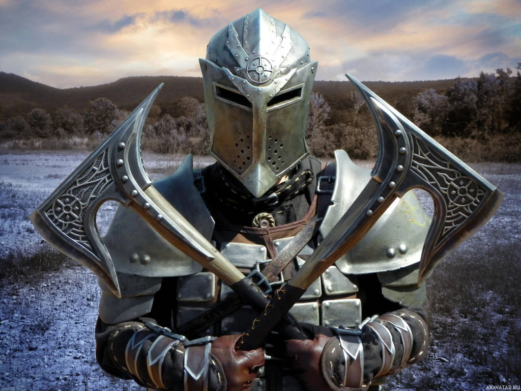 medieval warriors. They are holding an axe with both hands in front of them. The background suggests
