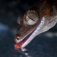 The image shows a gecko, which is an animal. It appears to be licking its lips, possibly in anticipation or after tasting something. Geckos are known for their unique appearance and behavior.