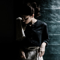 brunette hair and is wearing a dark top, possibly part of a uniform that suggests she may be a chef or someone involved in food preparation. There are various