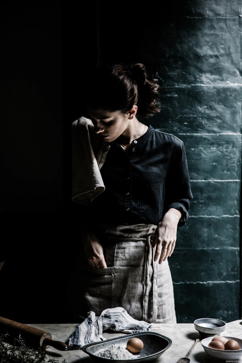 items on the counter around her, including bowls which could contain ingredients or prepared dishes. The lighting is dim, which might suggest
