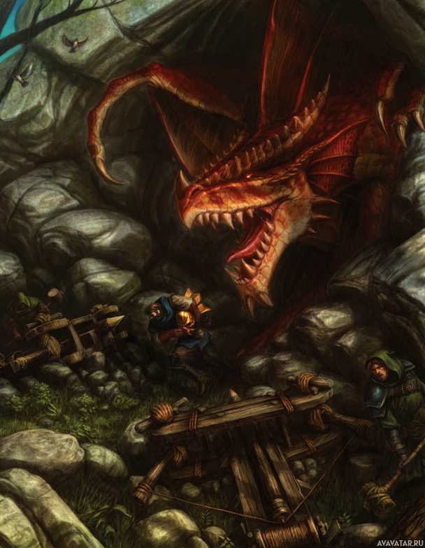 human figures in the image, which suggests interaction between the characters and the dragon. The setting is outdoors with rocky terrain, indicating
