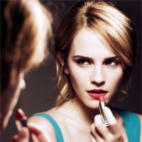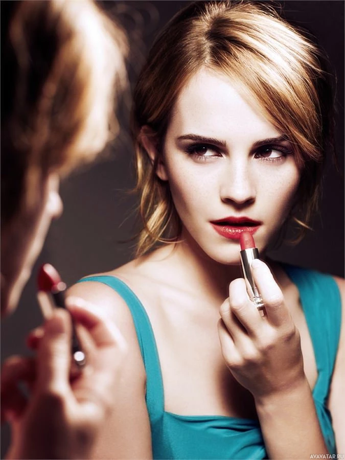 The image features a woman applying lipstick in front of a mirror. The reflection in the mirror shows her face with