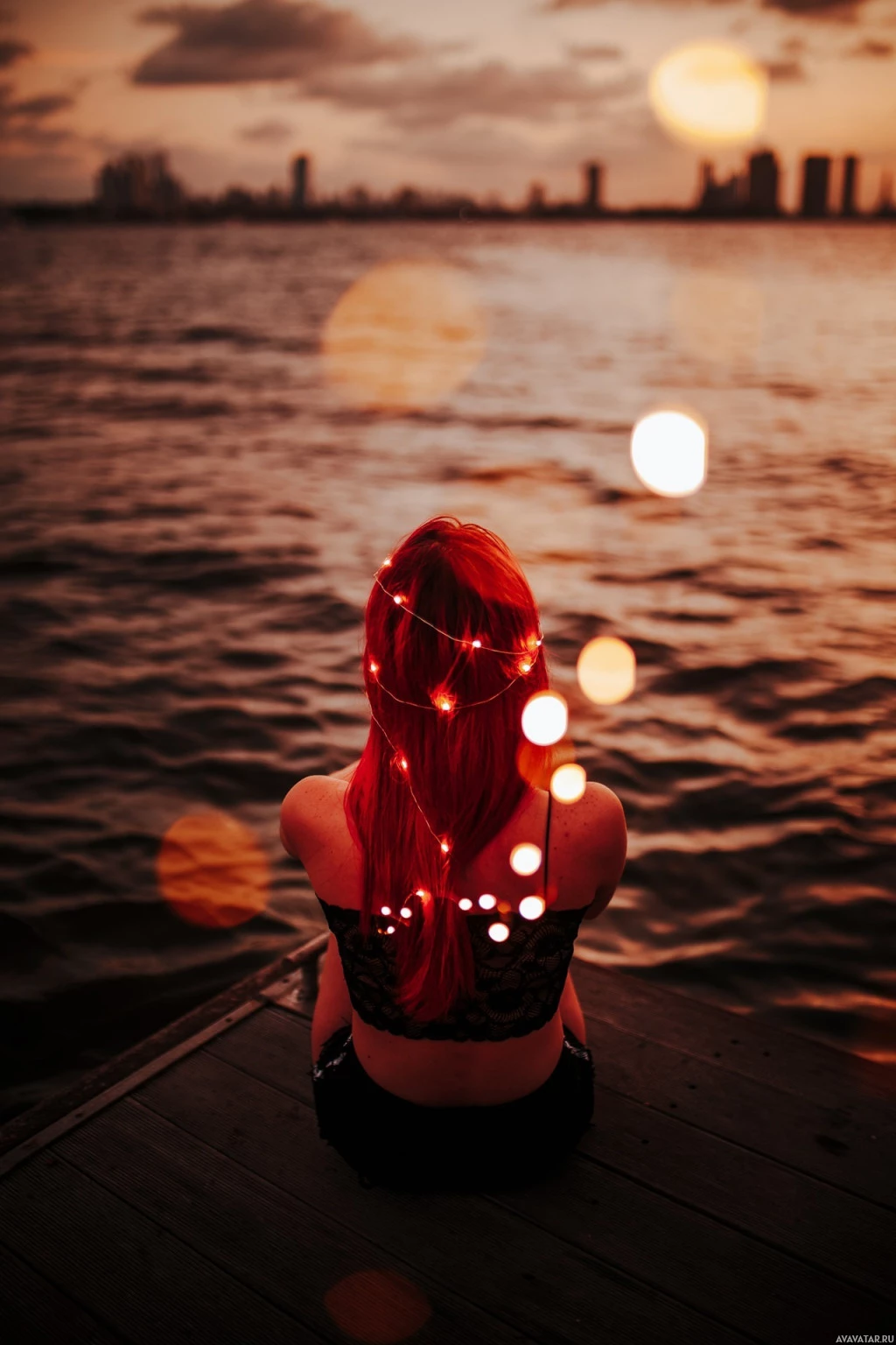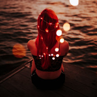 red hair, sitting on what appears to be a dock or pier overlooking a body of water during either sunrise or sunset, given the warm lighting. There are floating lights in the water that add a magical and serene atmosphere to the scene. The person is facing away from the camera, giving us a view of their back.