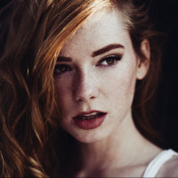 На снимке изображена молодая женщина с рыжими волосами, смотрящая прямо в камеру. Она носит макияж и имеет нейтральное выражение лица. Фон размыт, что делает акцент на ее особенностях.