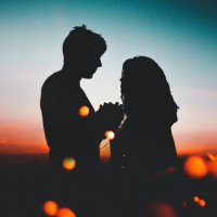 silhouettes of a man and a woman standing close together at sunset or during twilight. They appear to be engaged in