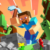 pixelated environment that resembles the world from the game itself. Steve is holding a pickaxe, ready for mining, and there are blocks of