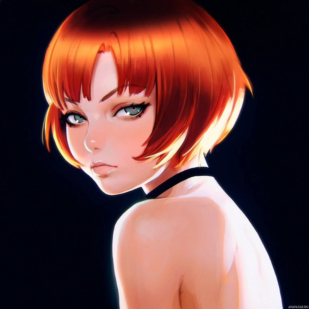 a female character with short, wavy red hair and blue eyes. She has a confident expression on her face and is wearing what appears to be a dark