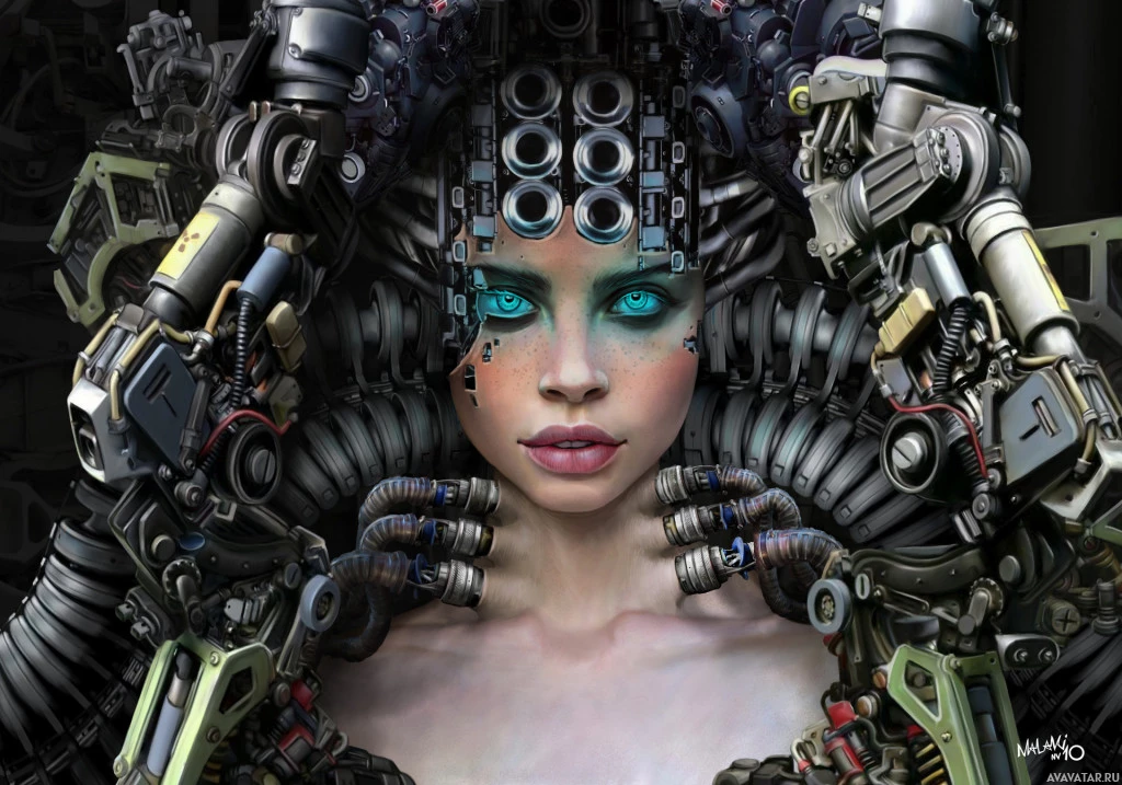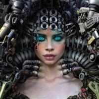 mechanical parts attached to her body. She has an intricate headpiece that resembles a complex assembly of gears and wires, blending human features with