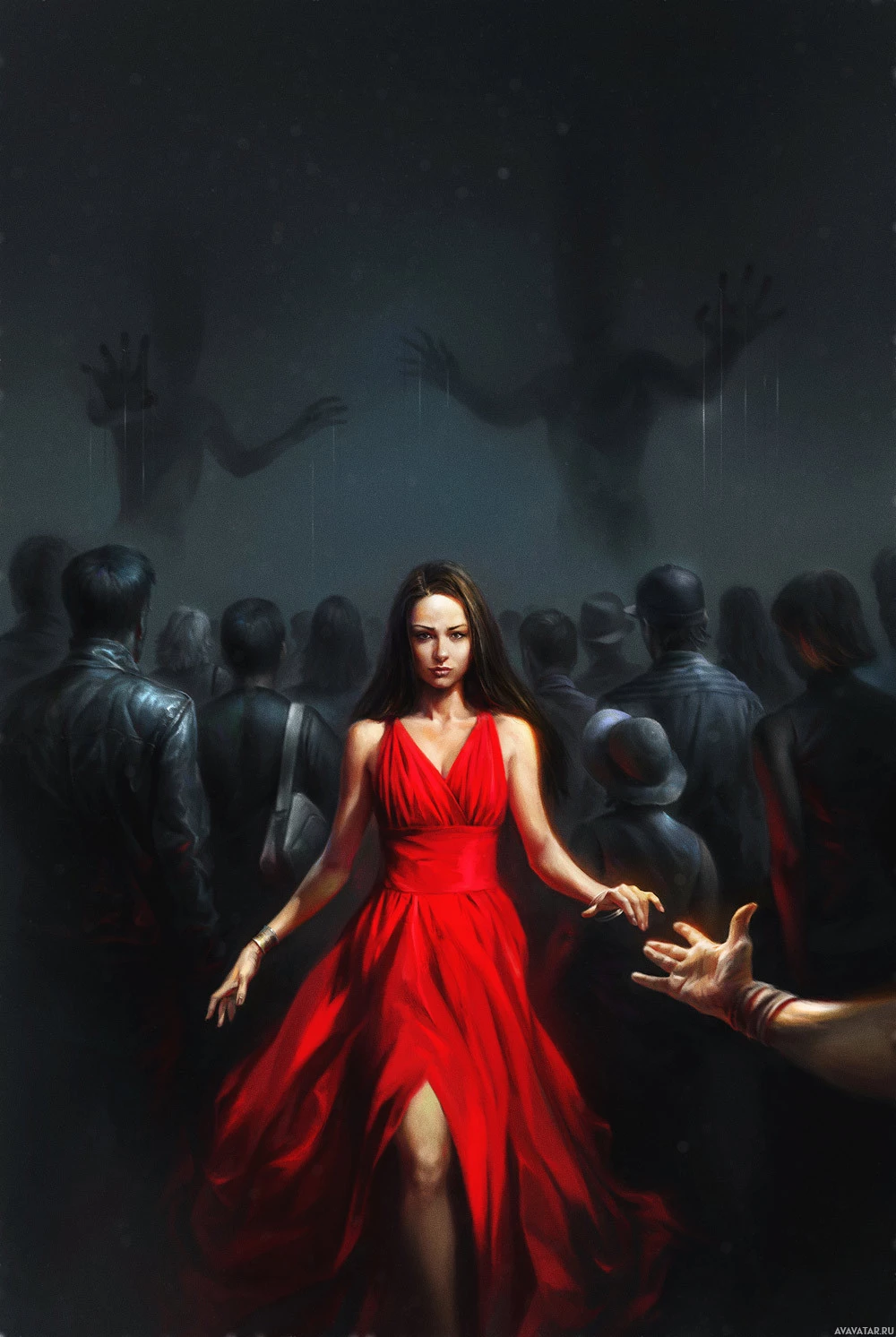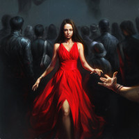 На данной картинке изображена женщина в красном платье, стоящая среди группы людей, которые, кажется, находятся в бедственном или хаотичном состоянии. Художественный стиль предполагает, что это может быть графический роман, фильм или видеоигра. Существует зловещая атмосфера с использованием темных цветов и выражений на лицах персонажей, которые указывают на какой-то конфликт или опасность.