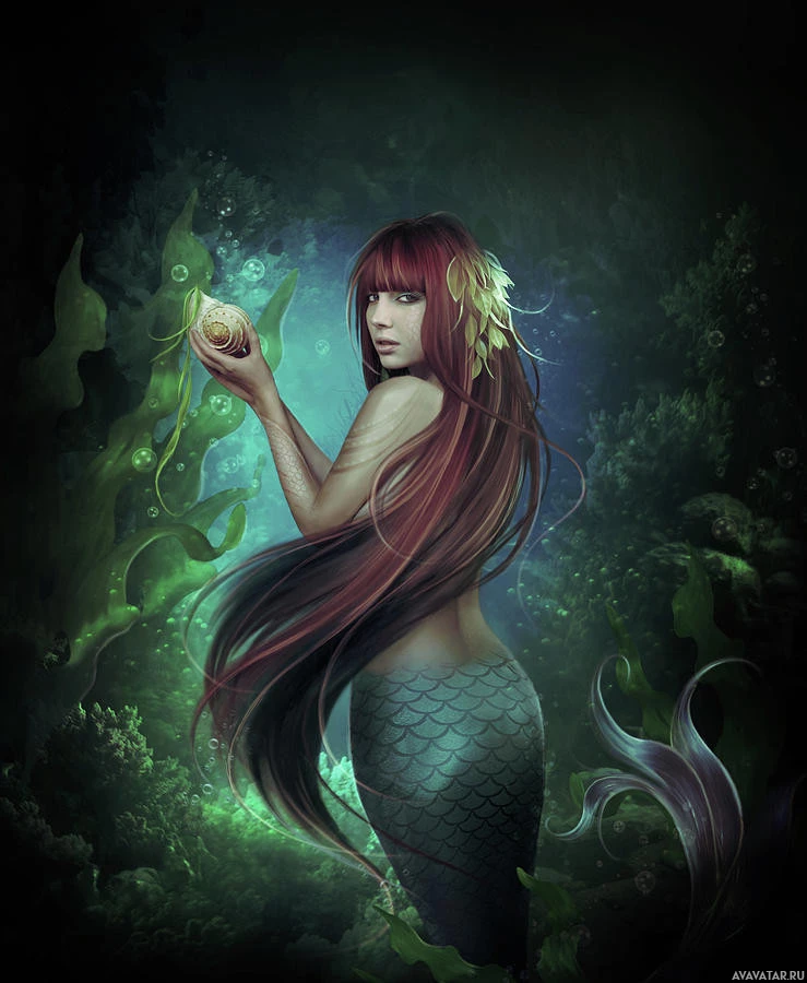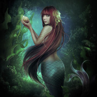 На картинке изображена русалка сзади, хвост которой виден и течет под водой. Она держит в руке жемчужину или драгоценный камень, стоя среди водных растений. Ее длинные волосы текут вниз, дополняя фэнтезийную тему произведения искусства. Помещение предполагает заколдованную или мифическую подводную среду.