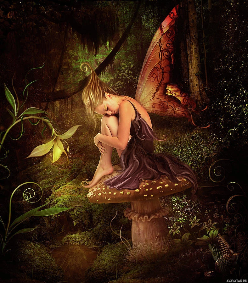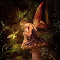 a female character who appears to be a fairy or sprite. She is seated on a mushroom in what seems to be