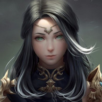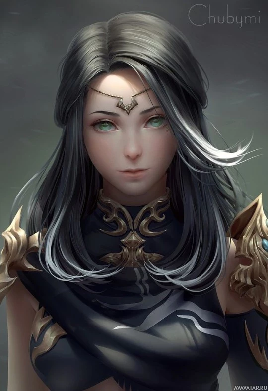 dark hair and green eyes, giving her a serene and somewhat ethereal appearance. She is wearing what appears to be armor or