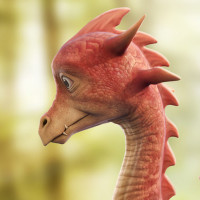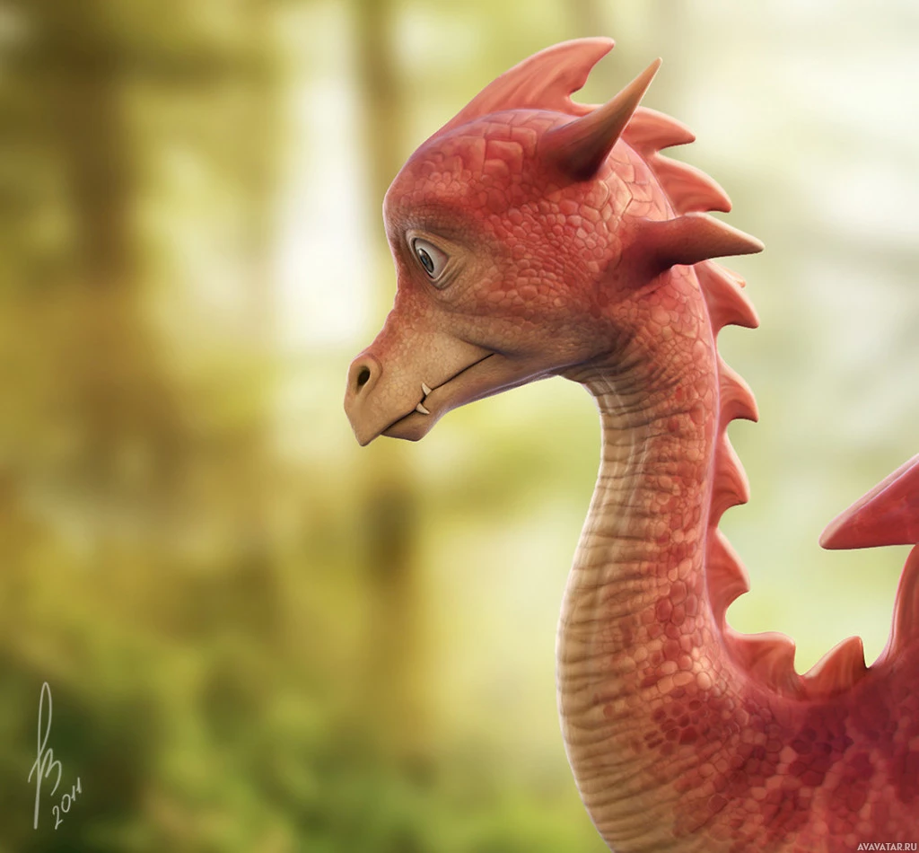 На картинке изображен анимированный дракон с красными чешуйками. Похоже, что он находится в естественной лесистой среде, которая предполагает фантастическую обстановку. Дракон смотрит вдаль и имеет дружелюбное выражение лица.