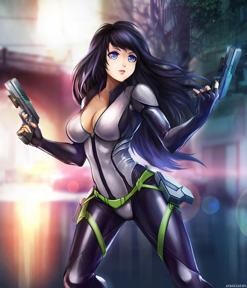 female character with purple hair. She is wearing a black and silver armor, reminiscent of anime or manga styles of illustration. In each hand, she holds what appears to be a pistol. Her attire suggests that she might be a part of a team or organization related to security or combat. The background hints at a setting with