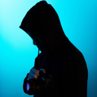 На картинке изображен силуэт человека, держащего то, что кажется камерой, предположительно фотографирующего. Человек носит капюшон, который добавляет анонимности или скрытой идентичности. Фон имеет голубоватый оттенок, обеспечивая контраст, который выделяет силуэтную фигуру.
