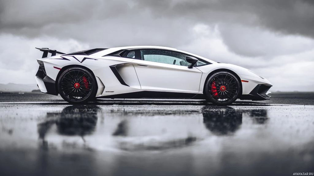 sports car. It is an Aventador model, as indicated by the distinctive design elements such as the doors and front of the vehicle. The car features a sleek aerodynamic shape with sharp lines and curves, which are typical characteristics of high-performance vehicles from this