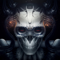 The image features a robotic skull with intricate mechanical and technological details. It appears to be set in a futuristic or science fiction context, potentially suggesting advanced robotics or artificial intelligence themes. The presence of the skull as part of the robot's design adds a striking visual element that merges organic and machine elements.