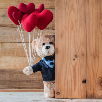 teddy bear holding a bouquet of red heart-shaped balloons. The teddy bear is positioned in front of