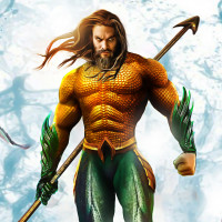 The image features the character Aquaman, known from comic books and movies. He is depicted in his iconic attire with green skin, a muscular build, long flowing hair, and holding a trident, which are all key elements of his superhero costume.