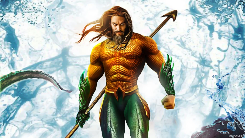 На картинке изображен персонаж Аквамен, известный по комиксам и фильмам. Он изображен в своем культовом наряде с зеленой кожей, мускулистым телосложением, длинными волосами и трезубцем, которые являются ключевыми элементами его костюма супергероя.